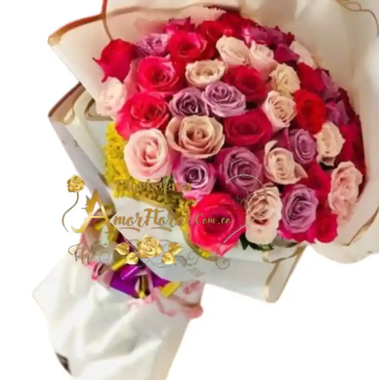 bouquet por 50 rosas colores surtidos, si deseas un mensaje para la tarjeta lo puedes dejar escrito en el área de observaciones o escribirnos al whatsapp al 3143111616 y enviarnos el mensaje para la tarjeta.