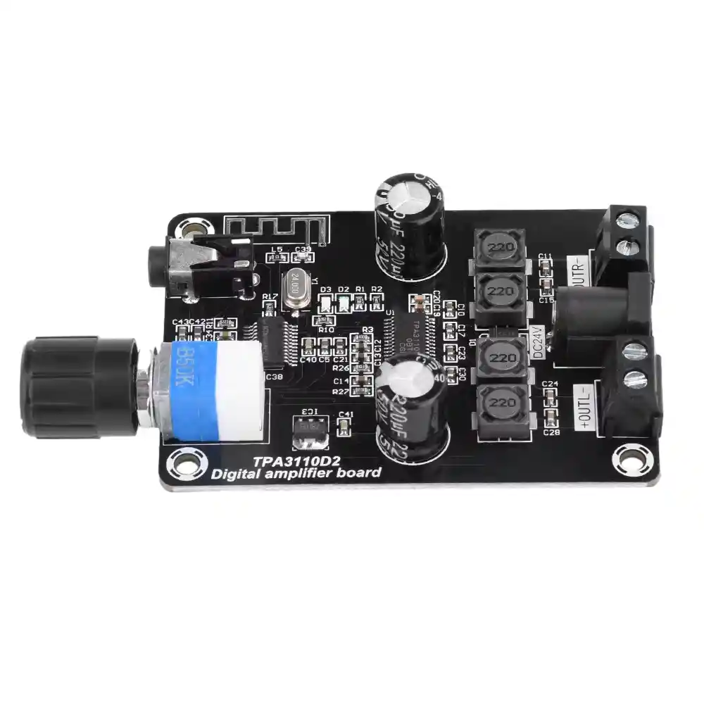 1. Alta eficiencia: El chip TPA3110D2 mantiene una alta eficiencia en condiciones de alta potencia, lo que ayuda a reducir la generación de calor y el consumo de energía. 2. Compatible con BT 5.0: Al conectarse con BT 5.0, se puede conectar directamente a un teléfono móvil, con una distancia máxima de transmisión inalámbrica de 20 metros. 3. Amplio rango de voltaje: Admite una amplia gama de voltajes de alimentación de 12 a 24 V CC, lo que mejora su aplicabilidad en diferentes entornos de energía. 4. Amplia aplicabilidad: La potencia de salida dual de 30 W se adapta a la mayoría de las ocasiones y es ideal para sistemas de audio de bajo consumo, como altavoces portátiles, minicines, etc. 5. Fácil de usar: El chip cuenta con una configuración de salida de carga de puente integrada y un circuito periférico simple, lo que facilita a los diseñadores la rápida implementación de soluciones de amplificación de audio. Introducción del producto: Este modelo utiliza el chip TPA3110D2 original, emparejado con 5.0 BT para conexión directa a teléfonos móviles, con una distancia máxima de transmisión inalámbrica de 20 metros. Alimentación: 12~24 V CC. Potencia de salida: 30 W x 2 (30 W x 2 a 24 V, 15 W x 2 a 12 V). La potencia de salida dual de 30 W es ideal para la mayoría de las situaciones. Una presión superior al valor nominal máximo absoluto puede causar daños permanentes al equipo. La exposición prolongada a las condiciones nominales máximas absolutas puede afectar la fiabilidad del equipo. Parámetros: Nombre del producto: Placa amplificadora digital universal BT Modelo del producto: XH-A238 Selección de chip: TPA3110D2 Voltaje de entrada: 12~24 V CC Entrada de audio: AUX/BT Número de canales: Doble canal Potencia de salida: 30 W x 2 Tamaño: 50 x 70 x 15 mm LA COMPRA INCLUYE: 1x AMPLIFICADOR AUDIO DC12-24V XH-A238