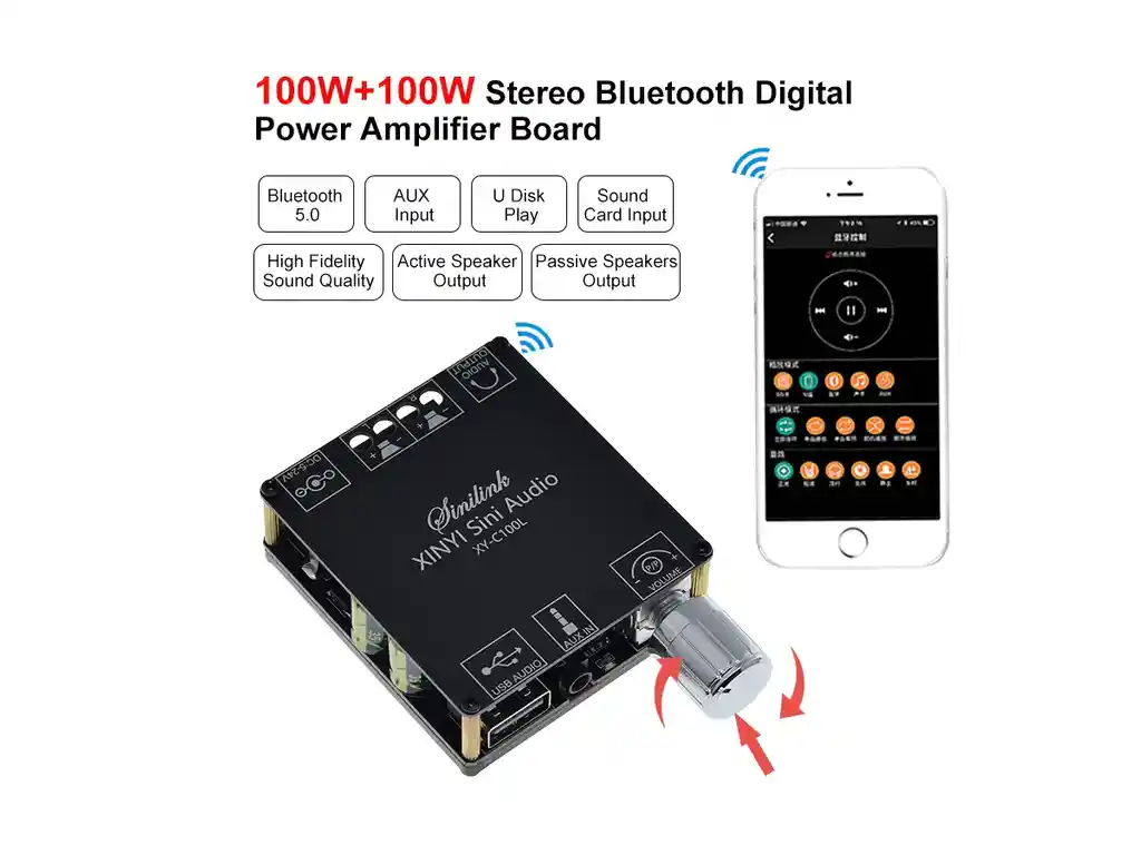 Nombre: Placa de amplificador de potencia Modelo: XY-C100L Potencia máxima por canal: 100W Canales: 2 (2.0) Versión de Bluetooth: 5.0 Altavoces adaptados: 30-300W 4 ohmios-8 ohmios Voltaje de la fuente de alimentación: DC8-26V Distancia de transmisión: 15m Color: negro Material: plástico Tamaño: 58 x 53 x 18 mm LA COMPRA INCLUYE: 1x AMPLIFICADOR AUDIO BLUETOOTH 5.0 TPA3116 XY-C100L 2x100W