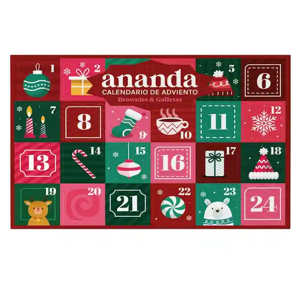 Caka Con Motivo de Calendario de Adviento. Cada Detalle de Esta Auténtica Caja Navideña Está Pensado Para Despertar Emociones y Sabores Únicos. Ananda Presenta Sus Bocados de Brownie y Galletas Variados un Surtido Artesanal Dispuesto en Una Caja Con 24 Compartimentos Perfecta Para Usar Como Calendario de Adviento o Como un Obsequio Elegante y Memorable. Dentro Encontrarás Creaciones Que Combinan Texturas y Aromas Irresistibles: Brownie Cheesecake Tejita Brownie Blondie de Almendra Brownie Milo y Brownie de Chocolate Junto a Galletas de Macadamia Praliné de Almendras y Frutos Rojos. Completan Esta Experiencia Los Tradicionales Alfajores Rellenos de Arequipe Incluso Una Versión en Forma de Estrella Que Realza el Espíritu Festivo. Todo Viene en un Empaque Decorado Con Motivos Navideños Lleno de Color Brillo y Calidez.
