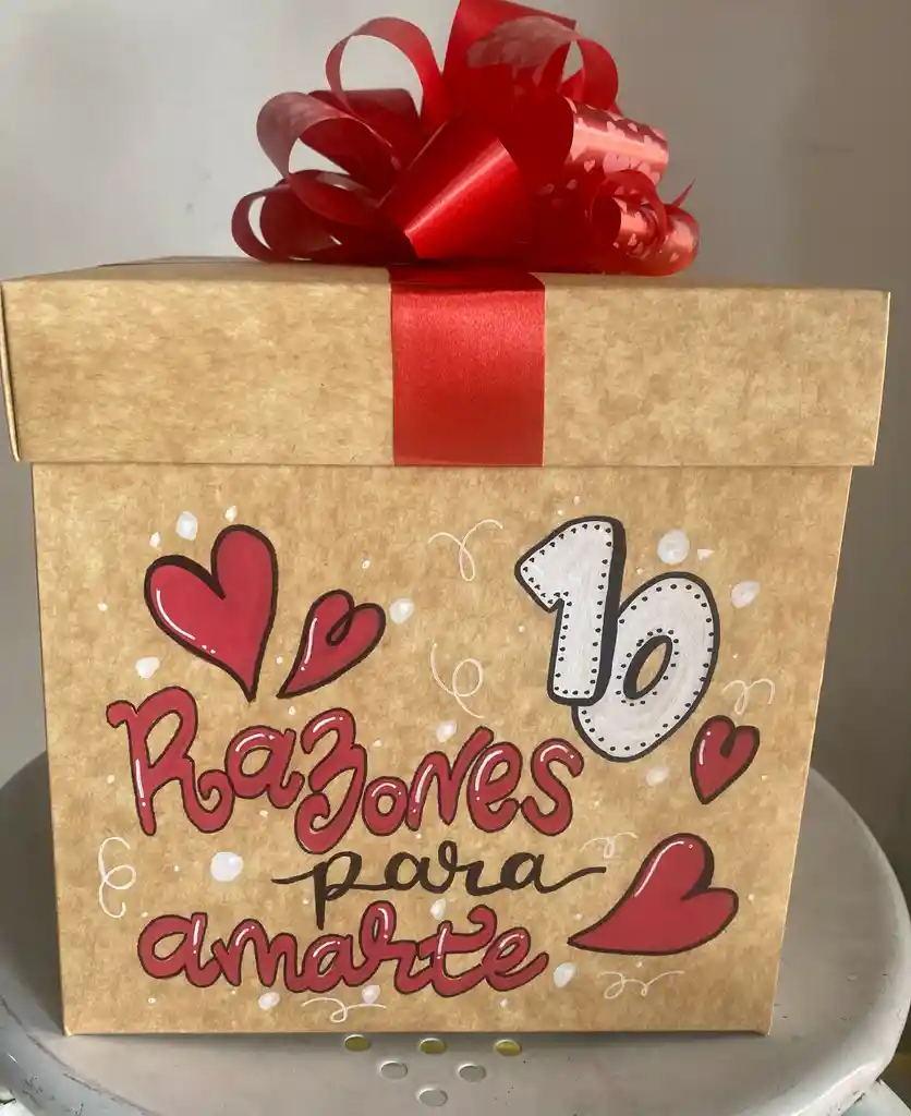 Caja decorada con moño 10 tarjetas de la canción 10 razones para amarte y en el fondo la caja letras de chocolate de te amo