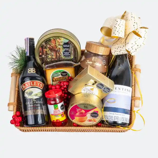Crema de Whisky | Bailey´s - 700 ml Vino | Vicentino - 750 ml Chocolates Ferrero - 50 gr Cerezas - 125 gr Galleta Golden Danish - 113 gr Dulces Cavendish - 175 gr Queso ahumado | Tilsiter - 200 gr Canasta tejida bandeja - U Papel celofan y Moño navideño - U