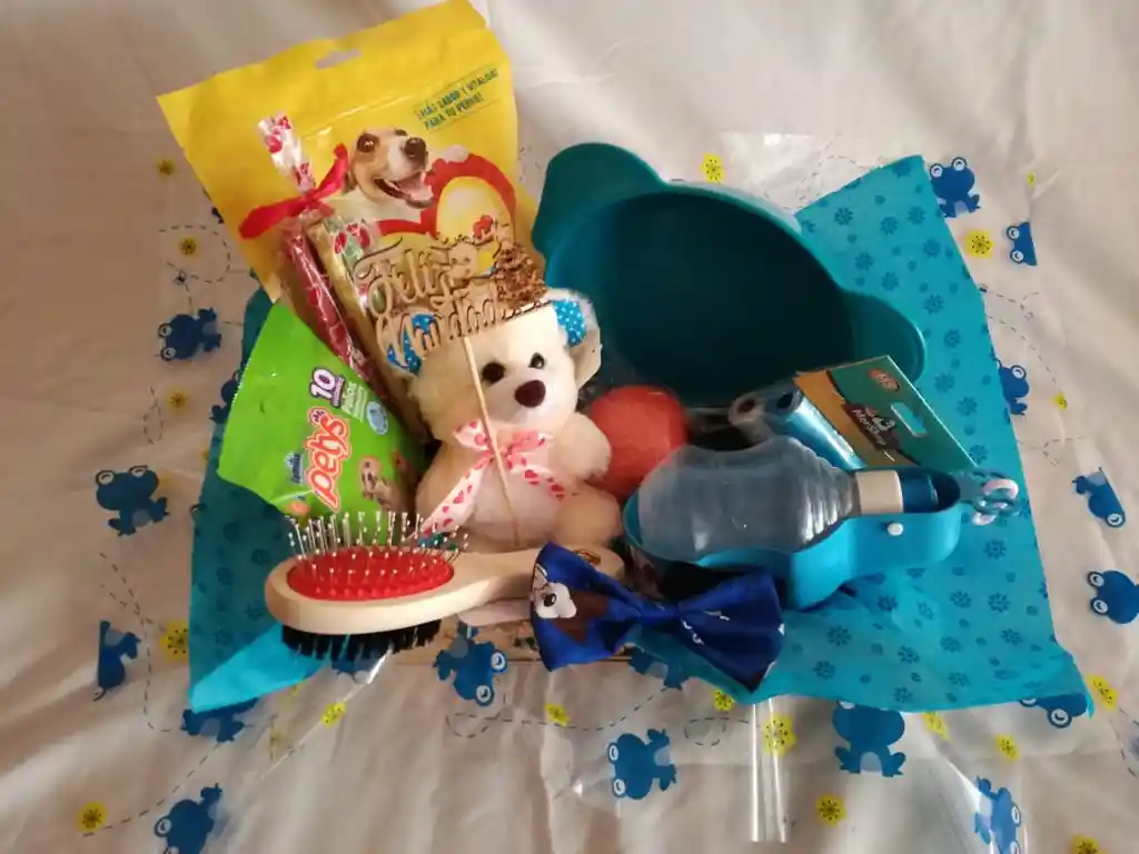Hermosa ancheta para perrito incluye: : Bocaditos can amor original o multi verduras,, peinilla doble, cabanos x 10 unidades, peluche, corbatín, pelota rosada, bebedero pequeño rosado, paquete bolsas excremento x 3 unidades, plato, pin mini y canasta mediana. Con tu aporte estaremos donando a fundaciones de perritos y gatitos.