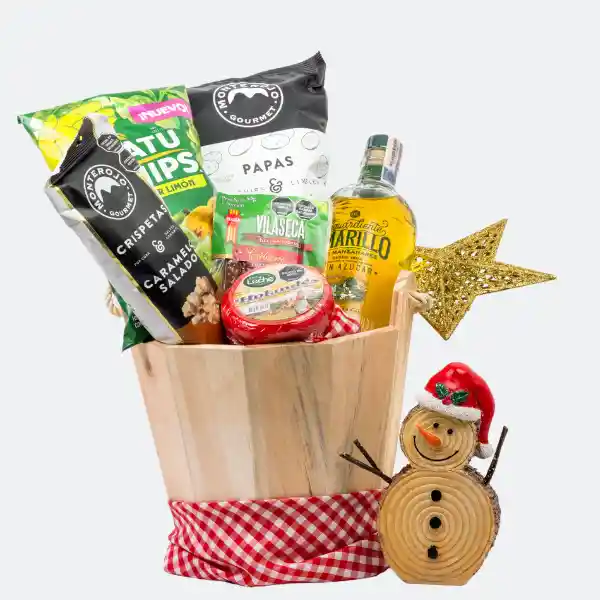 Aguardiente amarillo - 750 ml Natuchips - 120 gr Cabano - 50 gr Papas - 100 gr Crispetas - 50 gr Queso Holandés - 250 gr Valde de madera en color crudo - U Papel celofan y Moño navideño - U
