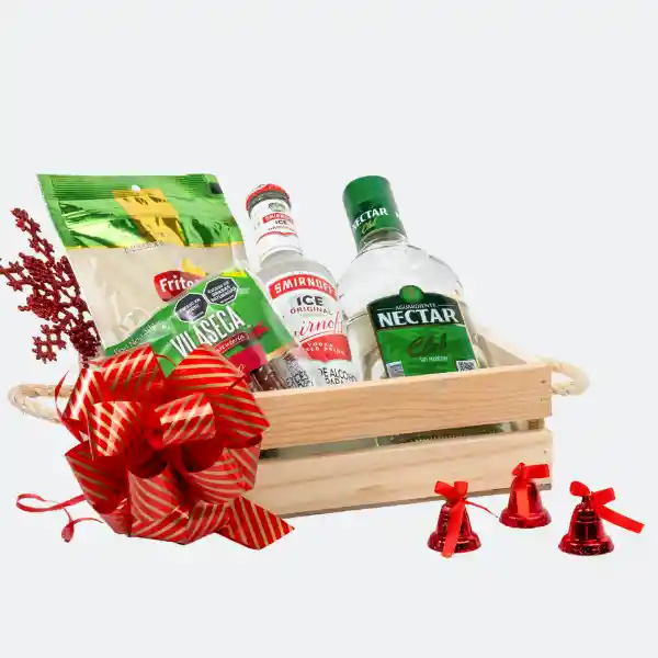 Aguardiente Nectar - 375 ml Smirnoff Ice Vodka - 275 ml Maní Mix - 170 gr Cabano - 50 gr Huacal mini - U Papel celofan y Moño navideño - U