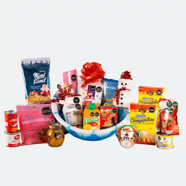 Fruttsi - 500 ml Galletas Bls - 120 gr Buñuelos - 200 gr Natilla - 200 gr Maíz dulce - 185 gr Salchicha viena - 150 gr Panettone - 80 gr Durazno bombillo - 280 gr Manjar blanco - 200 gr Masmelos - 80 gr Maní - 140 gr Salsa de tomate - 110 gr Merenguitos - 18 gr Mayonesa - 200 gr Sardinas - 155 gr Barquillos - 150 gr Platón