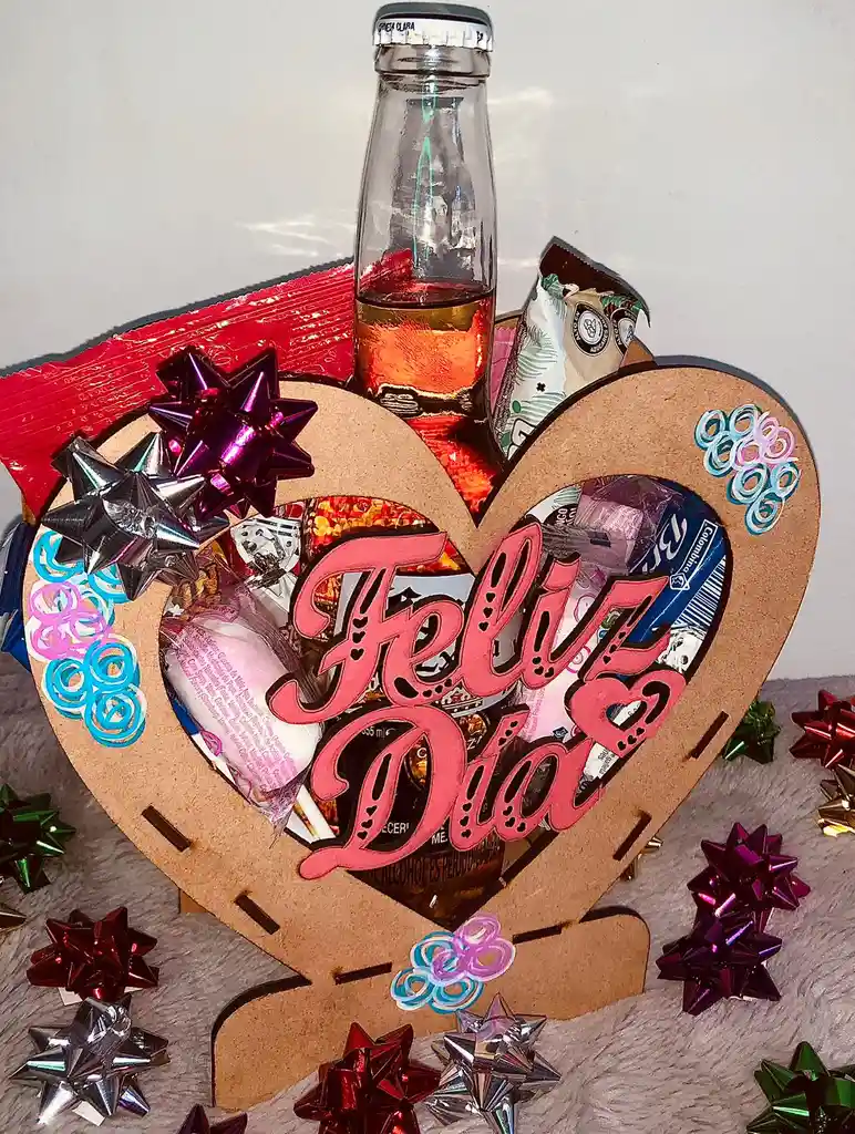 Ancheta en forma de corazón 1 Cerveza corona 1 Gomitas 1 Gomas tubos ácidos 2 Galletas bridge vainilla 3 Masmelos 1 Chao de cereza 1 Bombón 2 Confites Choco Break 1 Gol 1 Llavero