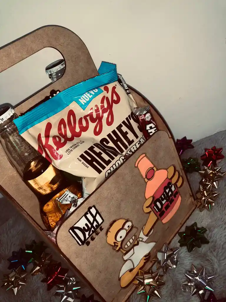 Ancheta de homero simpson 2 Cervezas corona 1 Gomitas 1 Galleta bridge de vainilla 1 Gela play 1 Chao de fresa 4 Masmelos 1 Gol de coco 1 gomas tubos ácidos 1 Trululu sabores 1 Bombón 2 Confites chocho break