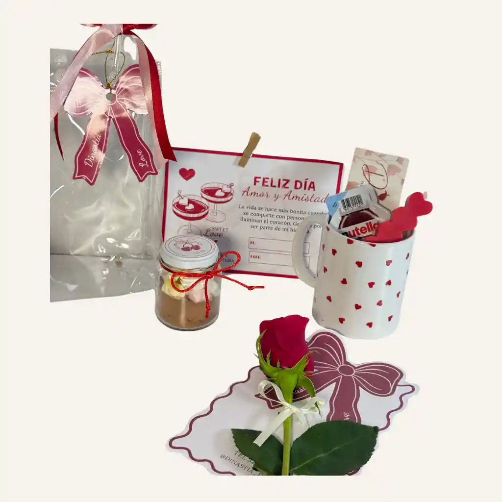 Un detalle romántico y diferente para celebrar Amor y Amistad con dulzura y estilo. Bolso transparente edición Amor y Amistad, mug personalizado, Nutella mini, tarjeta con rosa, tarro de chocolate con malvaviscos, vela aromática, tarjeta para dedicatoria