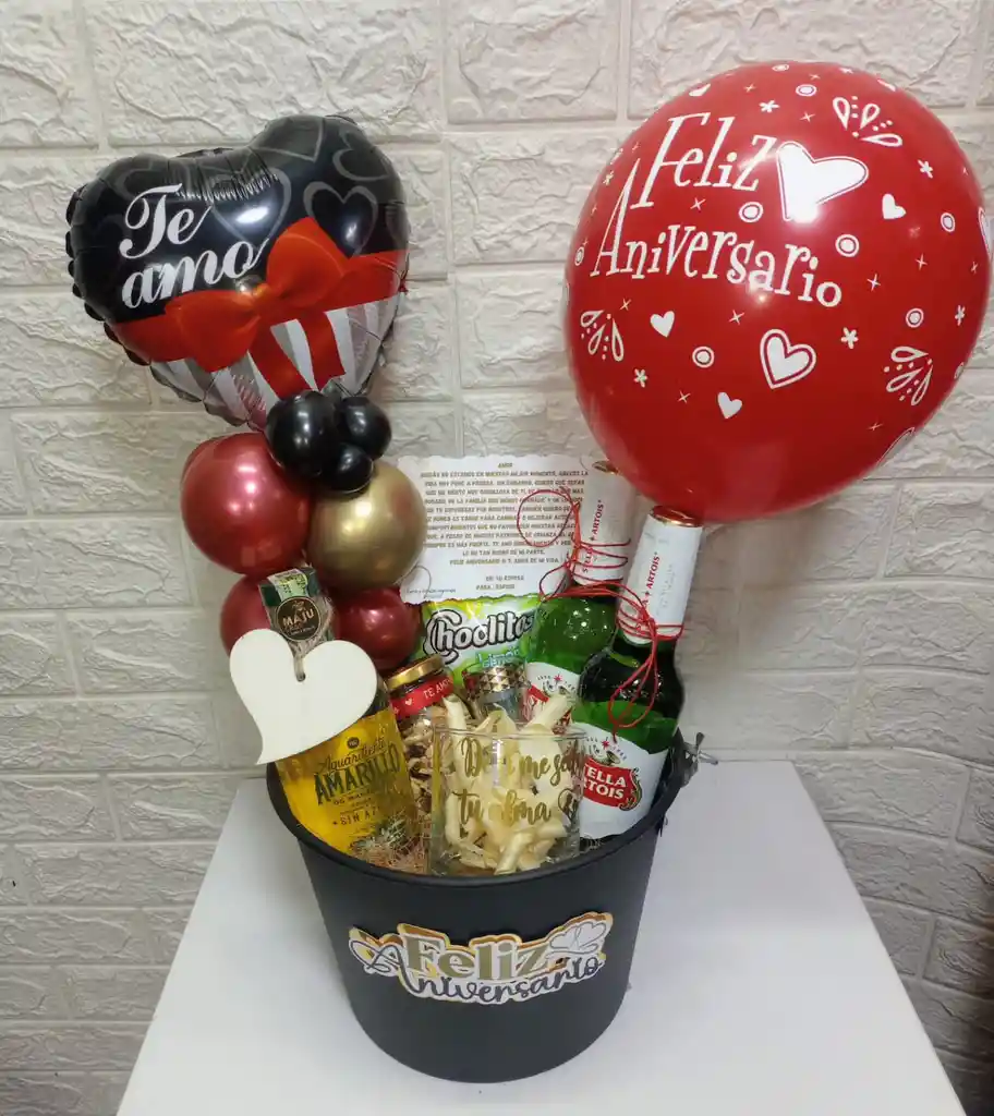 Características* - Globo grande de 'Feliz Aniversario' rojo - Globo en forma de corazón 'Te amo' negro - Decoración con globos pequeños rojos y dorados - Botella de Aguardiente Amarillo manzanares - Dos cervezas Stella Artois - Snacks variados (Choclitos limón y frutos secos) - Vaso con diseño conmemorativo -Copa de aguardiente en cristal - Canasta decorada con la frase 'Feliz Aniversario' -Frasco con frutos secos - Tarjeta de felicitación para personalizar