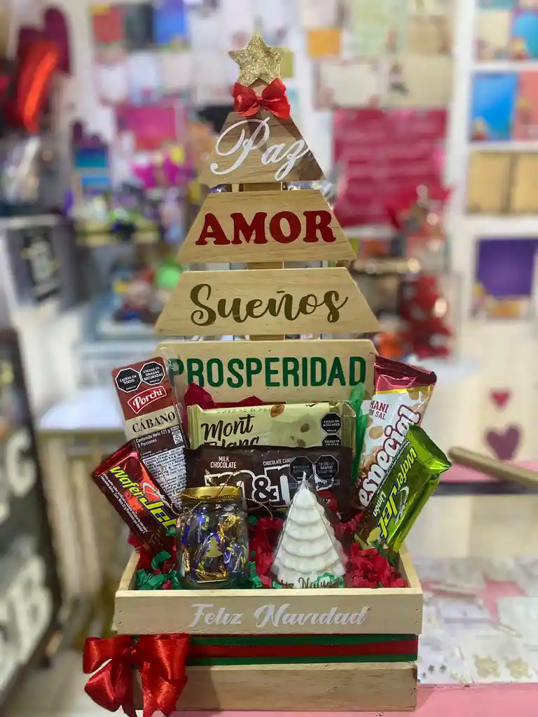 Hermosa ancheta con base decorada de navidad, chocolates, maní, cábanos, galletas recubiertas y vela decorativa navideña...
