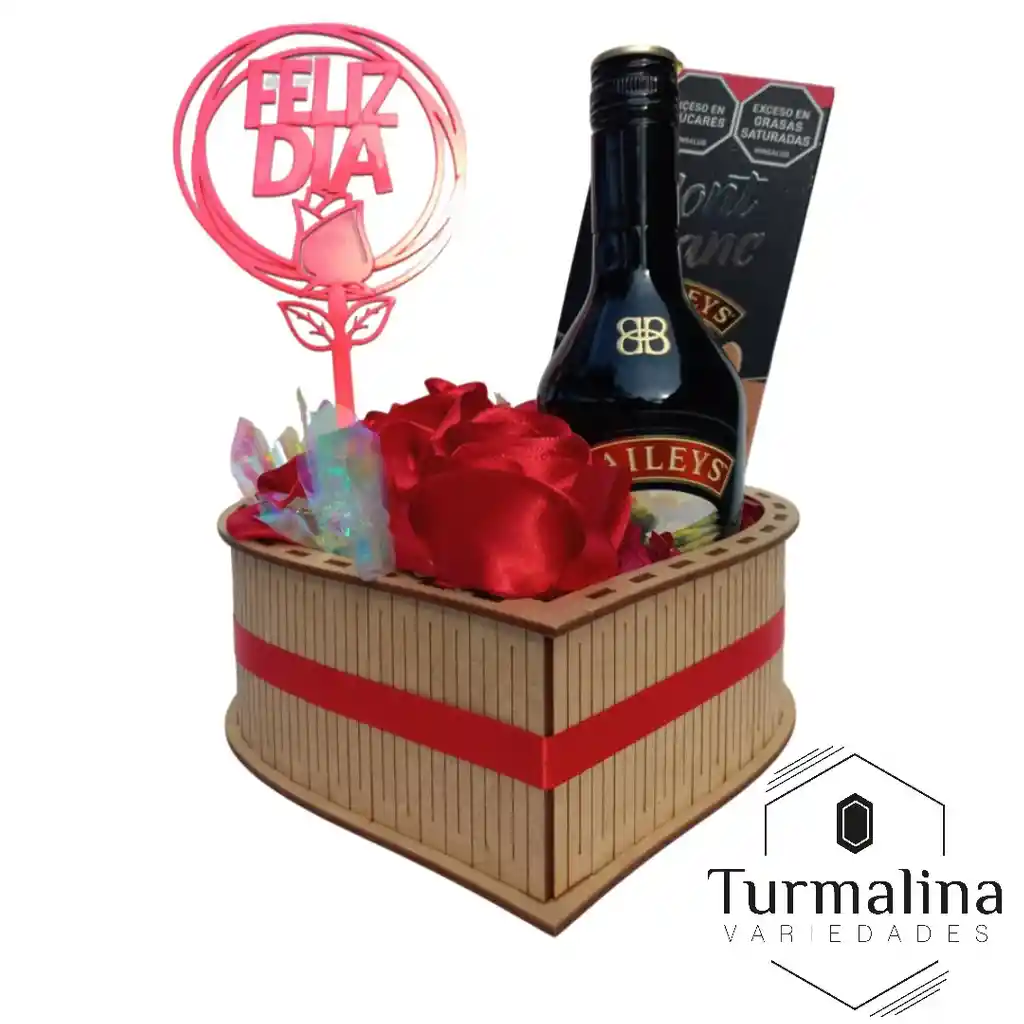 Hermosa Ancheta con Rosas Rojas en Técnica Flores Eterna en tela, viene en caja de madera con Baileys y Ferreros para celebrar la vida y el amor. Contine 1 Baileys de 375 ml 1 Chocolate montblanc baileys 80 gr 3 Flores Rojas Eterna en tela.