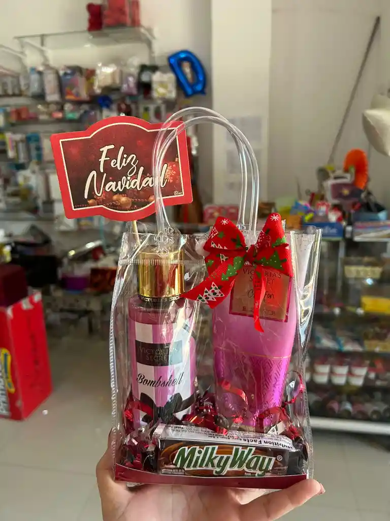 Ancheta Bolso Manija contiene perfume y crema de victoria secret y un chocolate snicker