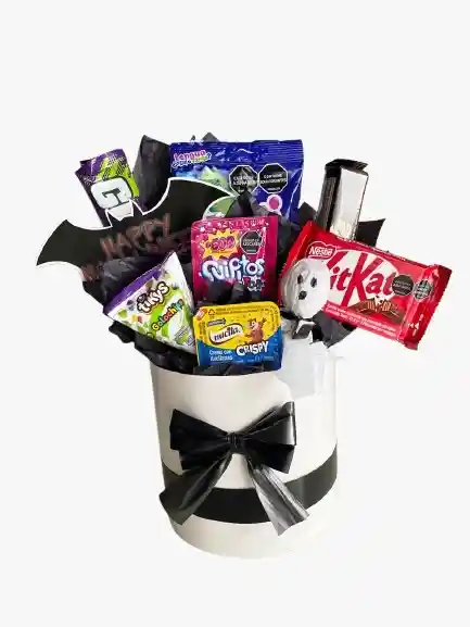 Cilindro encintado según temporada o personalizado, contiene chocolates gol, gomas dulces o acidas, quipitos, cocosete, kit kat, bombom bum fantasma, nucita, golochips