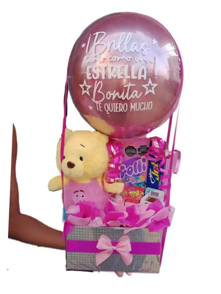 Ancheta Perfecta para enamorar: Caja rectangular forrada Globo burbuja personalizado 10 pulgadas mensaje: "¡Brillas tanto como una estrella! Bonita Te quiero mucho" ... Paquete de gomas Chocolatina jet mediana Mini Nutella Tipitin Masmelo individual Peluche Winnie pooh 20cm ... Decoración general Tamaño 60cm alto x 20ancho aprox.