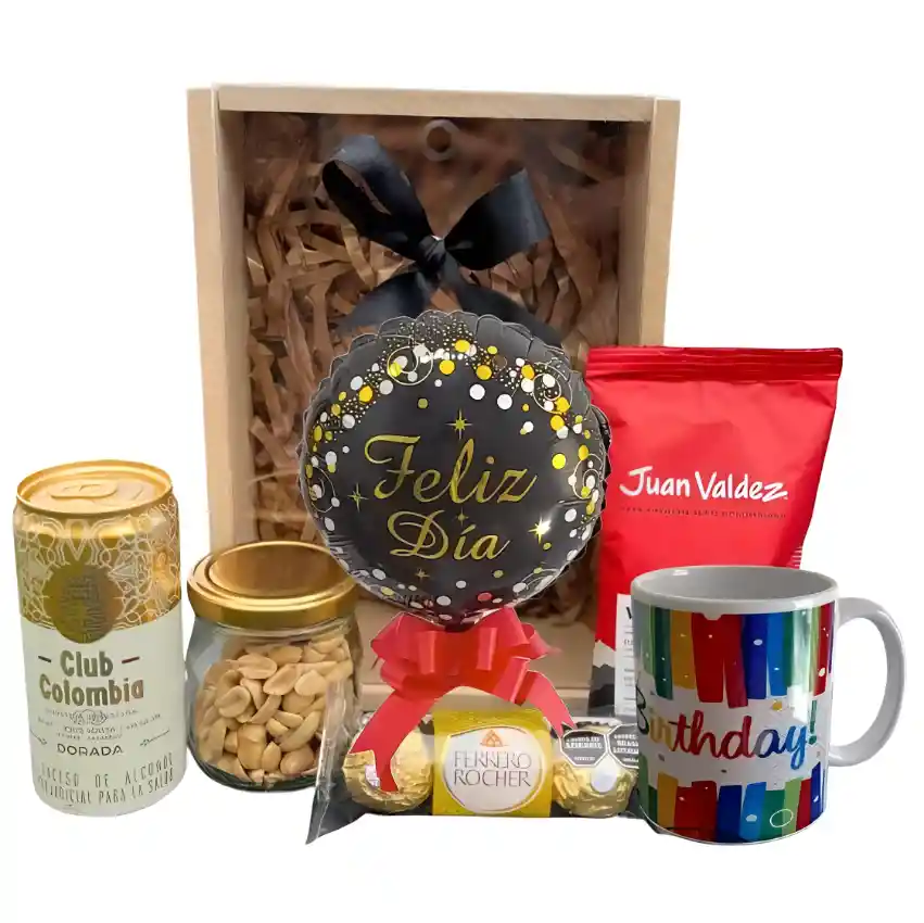 Caja de madera con Café Juan Valdez 1 libra, pocillo, Ferrero x3, tarrito de vidrio con maní y lata de cerveza con globo, moño y tarjeta