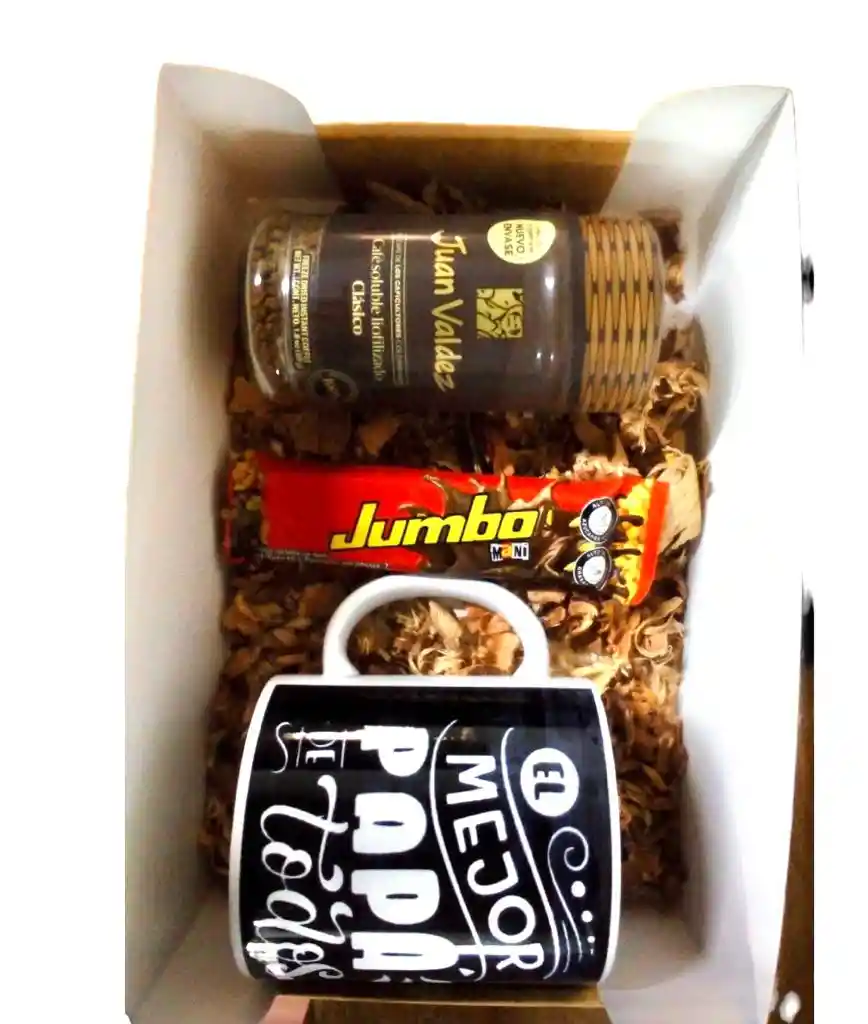 Caja decorativa que contiene: Frasco café de 50G, Chocolatina Jumbo y Pocillo decorativo para papá