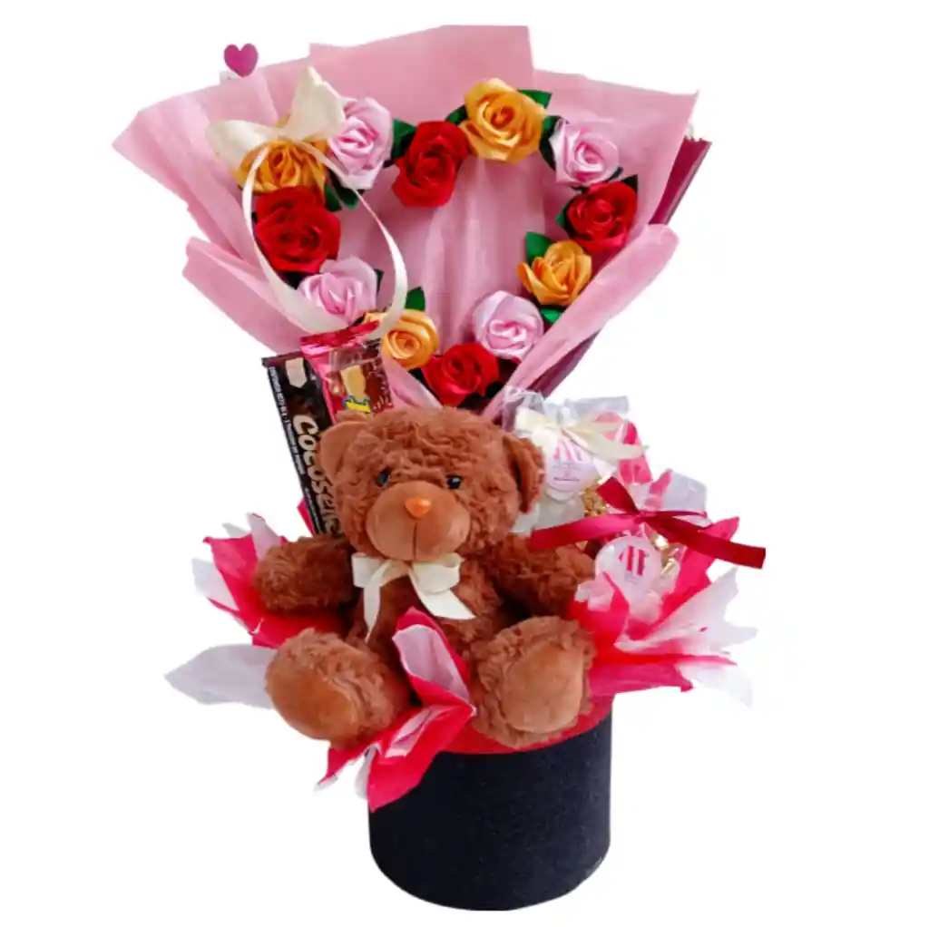 caja sorpresa FELIZ DIA AEste encantador regalo está diseñado para sorprender a esa persona especial, combinando un hermoso ramo de mini rosas eternas en forma de corazón con un adorable peluche, deliciosos chocolates y otros comestibles en una linda presentación. Cada elemento ha sido cuidadosamente seleccionado para expresar tu amor de manera única. ¡Haz de este día una celebración inolvidable y llena de magiaMORcaja sorpresa FELIZ DIA AMOR