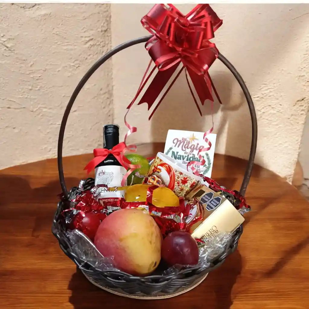 Hermosa Ancheta con frutas, Contiene: Botella de vino pequeña, Chocolates Ferrero, pocillo Mug , Chocolates Ferrero, mandarina, mango, carambolo, ciruelas