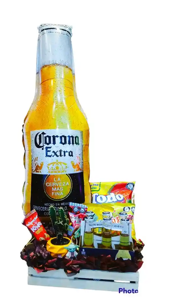 ESPECTACULAR ANCHETA UNISEX CON EXCLENTES PRODUCTOS IDEAL PARA UN REGALOS SORPESA A ESA PERSONA TAN ESPECIAL DECORADA Y PENSADA PARA SAPR UN BUEN MOMENTO CAJA DE MADERA GLOBO GRANDE SNACKS SURTIDOS SIX PACK DE CERVEZA CACTUS DECORATIVO LLAVERO DE LUJO