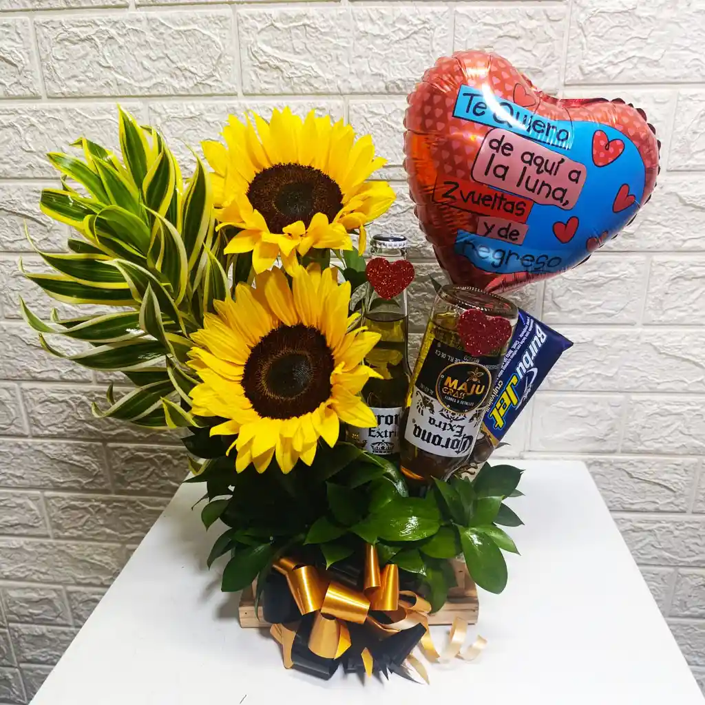ancheta de girasoles con 2 cerveza corona y chocolatina