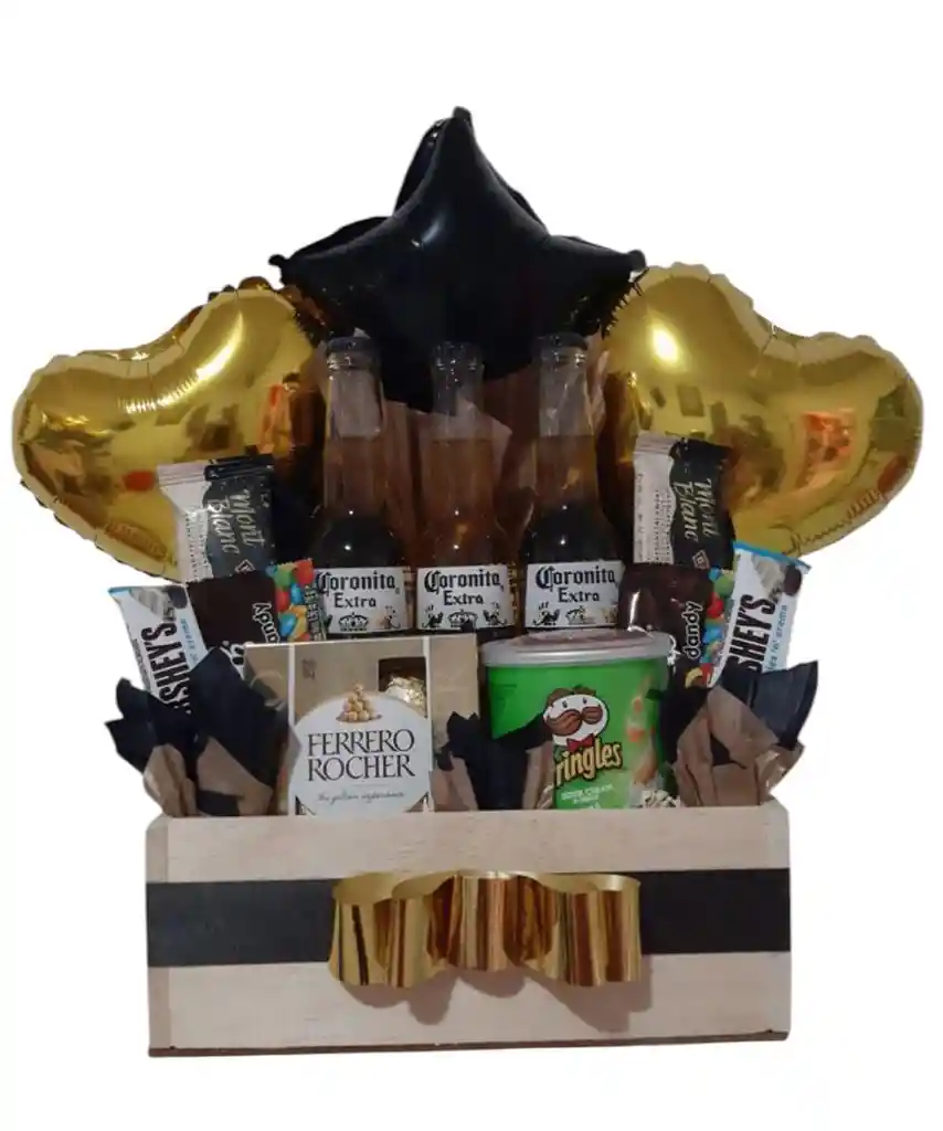 caja de madera, tres coronitas, papas en tarro, ferrero por 4, dulces varios y decoracion, empaque