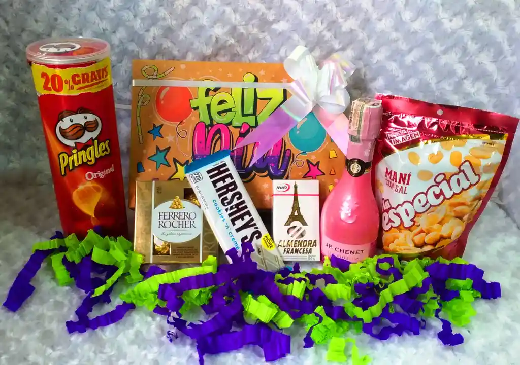 Ancheta botella champagne JP. CHENET. Contenido: Caja estampada de acuerdo a genero - Champagne JP. CHENET 200ml - Chocolates Ferrero x 4 - Maní sal La Especial doypack 180gr - Almendras Italo 50gr - Chocolatina Hershey`s 43gr - Papas Pringless grandes 149gr - Moño decorativo - Papel decorativo de acuerdo a gama de colores de la caja y genero. Nota: Después de la compra, por el chat habilitado en la plataforma , confirmar genero.