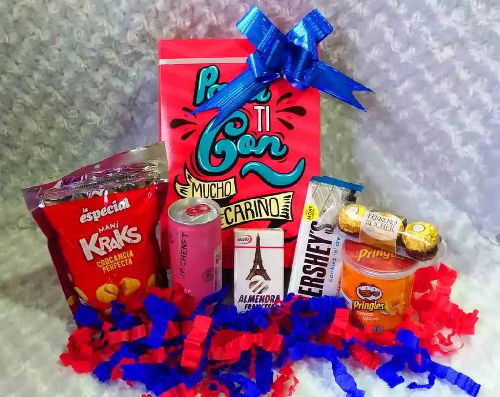 Ancheta botella champagne JP. CHENET. lata Contenido: Caja estampada de acuerdo a genero - Champagne JP. CHENET lata 250ml - Chocolates Ferrero x 3 - Maní Kraks doypack 140gr - Chocolatina Hershey`s 43gr - Papas Pringless 40gr - Almendras Italo 50gr - Moño decorativo - Papel decorativo de acuerdo a gama de colores de la caja y genero. Nota: Después de la compra, por el chat habilitado en la plataforma , confirmar genero.