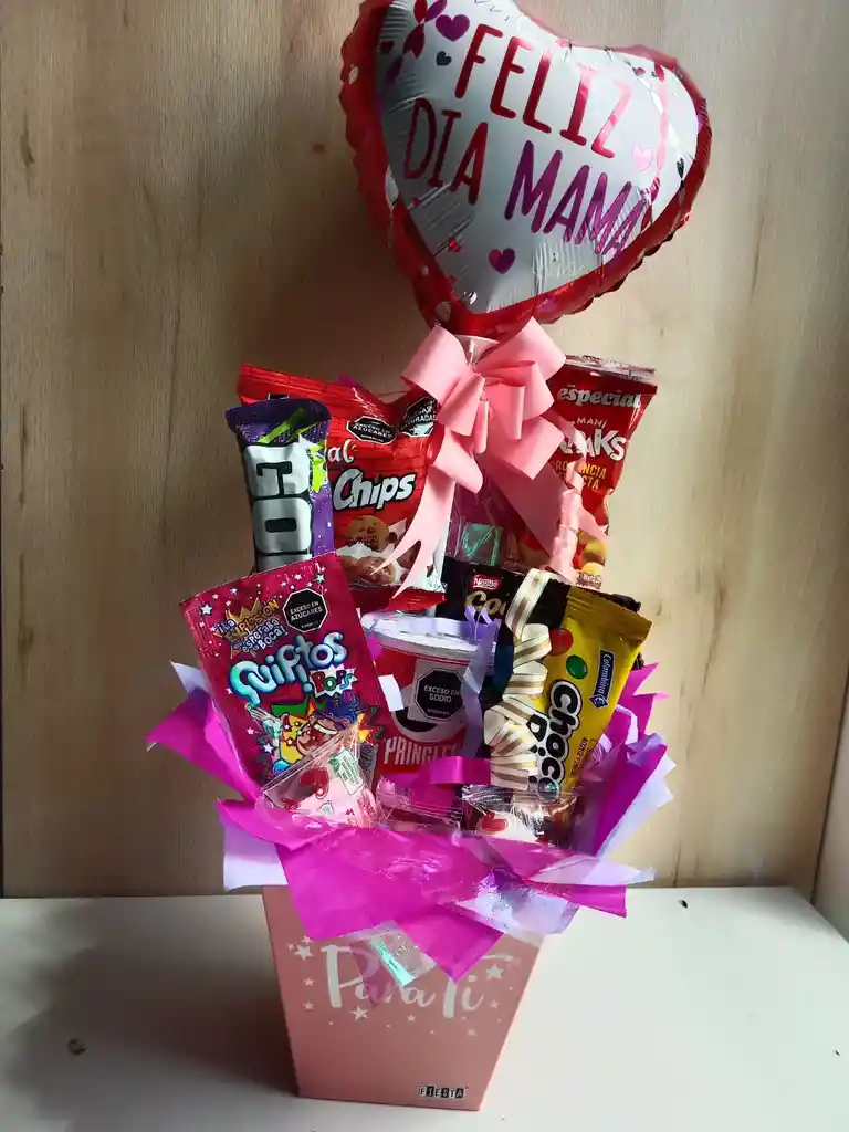 Ancheta de dulces, ideal para endulzar con amor. Contiene: 1 Minichips, 1 Tarro pq papas pringles, 1 Chocodisk, 1 Chocolatina Gol, 1 Galleta Mini cocosette, 1 Mani Krak, Masmelos, 1 Quipito, Empacado en Caja empaque cripetera mediana con globo metalizado y moño.