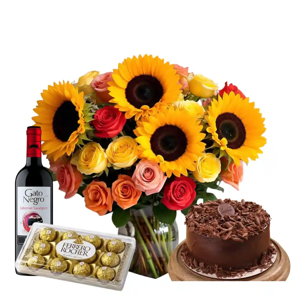 JARRON CON ROSAS MULTICOLOR Y GIRASOLES