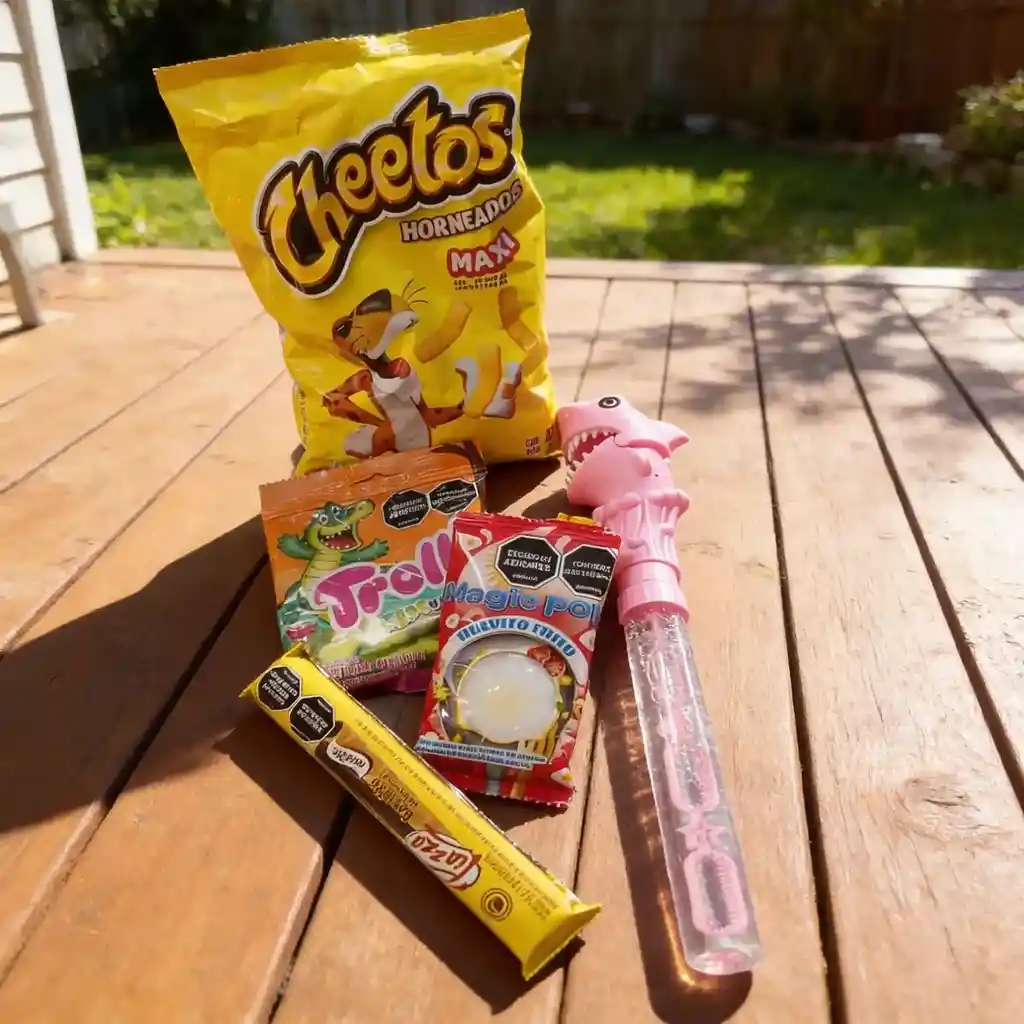 ancheta Combo Mecato y Dulces con Juguete Burbujero regalo perfecto para el dia del niño INCLUYE: - Bolsa de Cheetos horneados Max - Dulces Trolli - Caramelo Magic Pop -barquillo piazza - Juguete burbujero