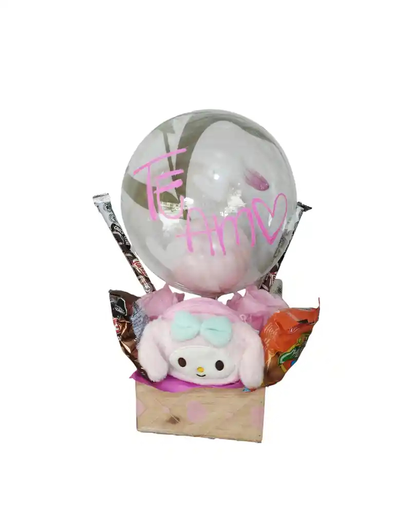 Ancheta en caja de maderita, con llavero-monedero de my melody, 1 snaky mini, 1 chontico de pollo, 2 piazzas, globo burbuja te amo