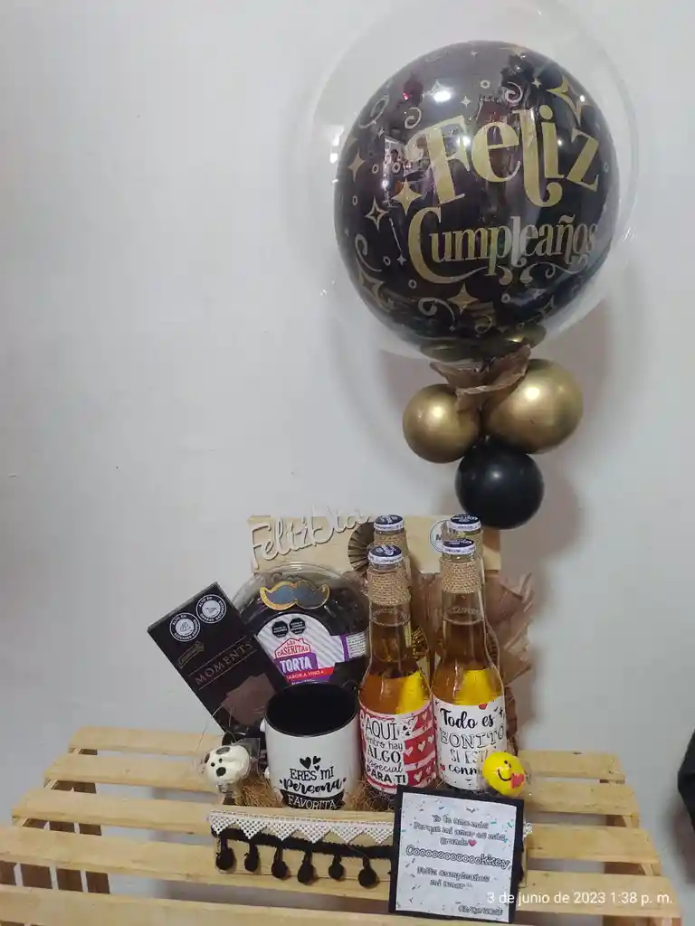 ancheta de cerveza , torta personal, chocolates , mug con mensaje y colombinas de masapan