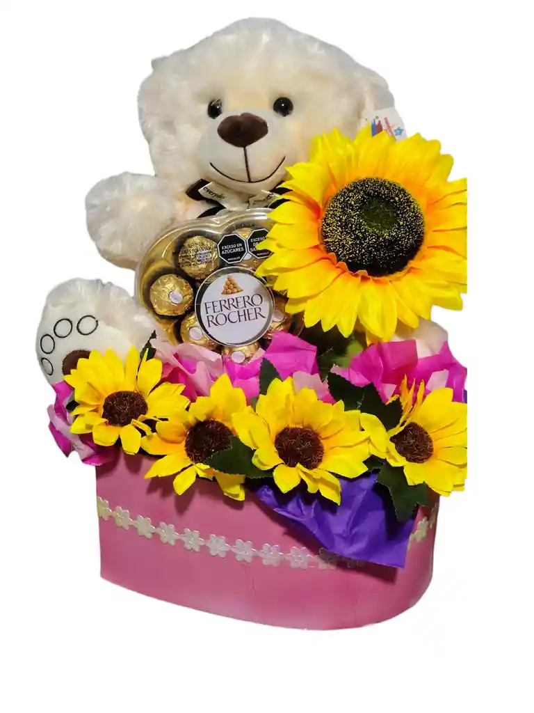 Ancheta con peluche de oso 30cm, girasoles artificiales, ferrero rocher conrazon x 8, caja de corazon dura