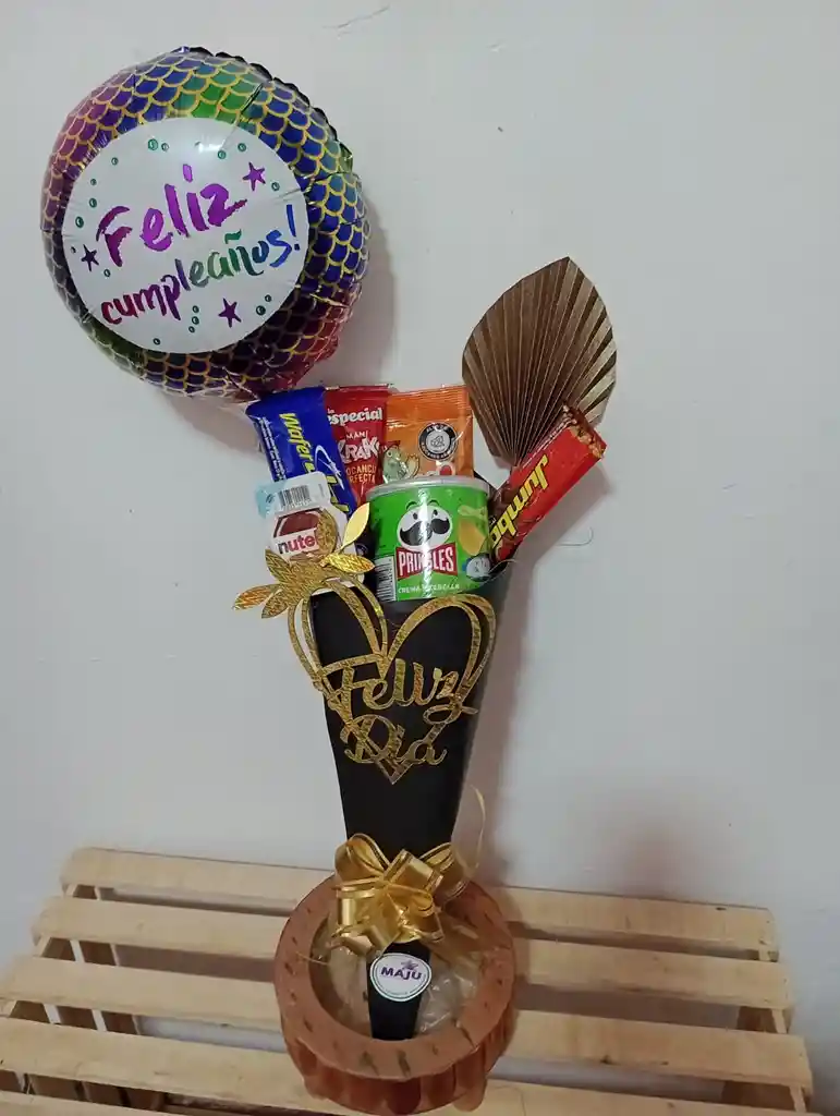 Ancheta cono dulcero papas, chocolates gomas.