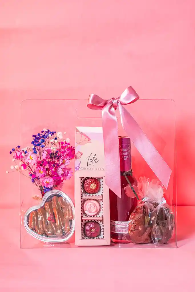 Ancheta en empaque transparente coronado con hermoso lazo satinado y acompañado con sutil arreglo floral Incluye: 1 Piba de vino artesanal de Santa Elena, Ant. 1 caja de bombones rellenos mixtos *3 Unid. 1 Brownie merlcochudo corazón 3 mini galletas rellenas.
