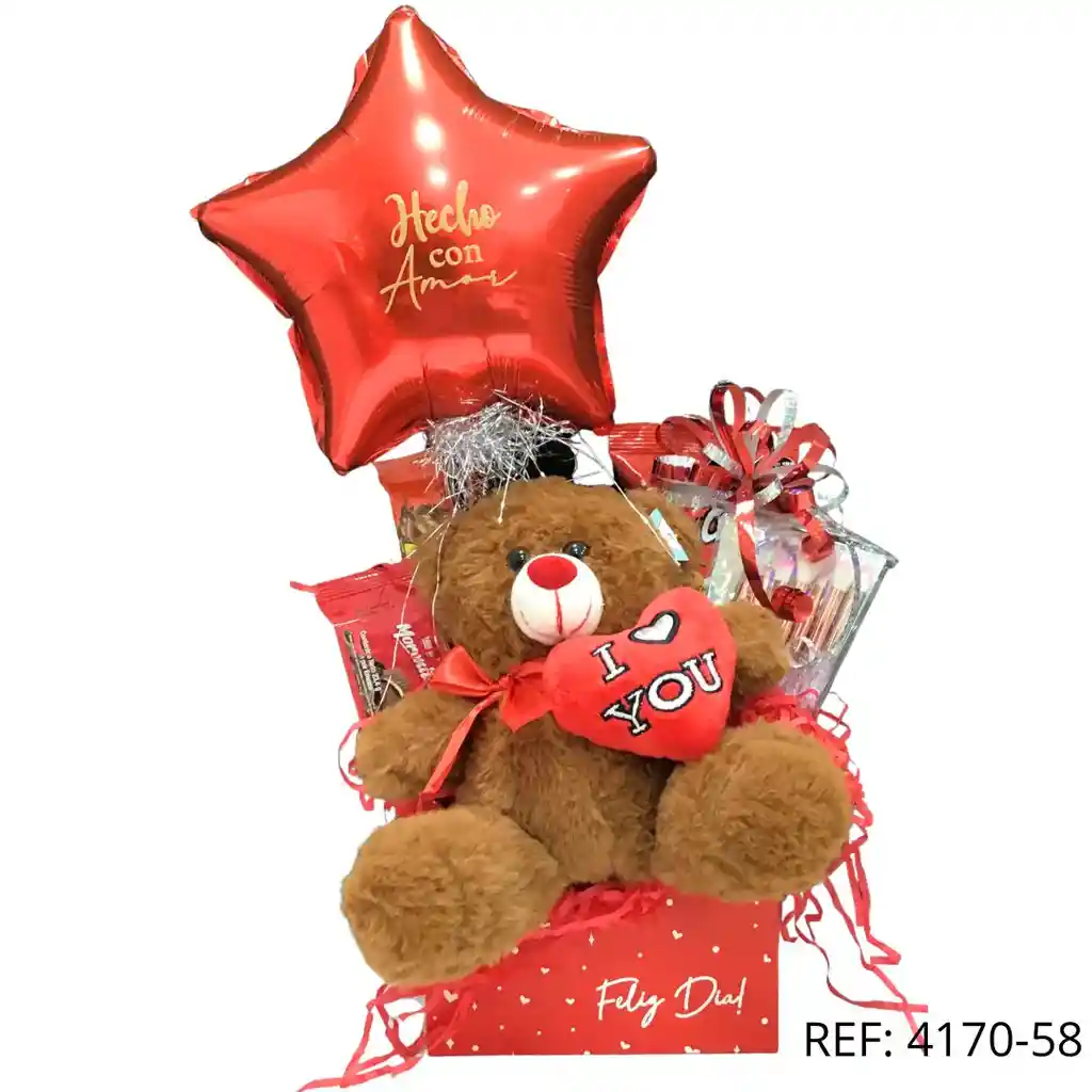 Arreglo sorpresa con oso de peluche, globo y chocolates. Detalle perfecto para amor y amistad.