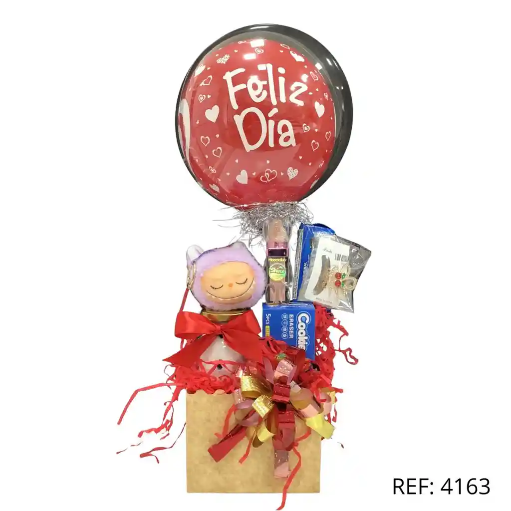 Caja sorpresa con globo “Feliz Día”, llavero y dulces, un detalle perfecto para regalar en amor y amistad.