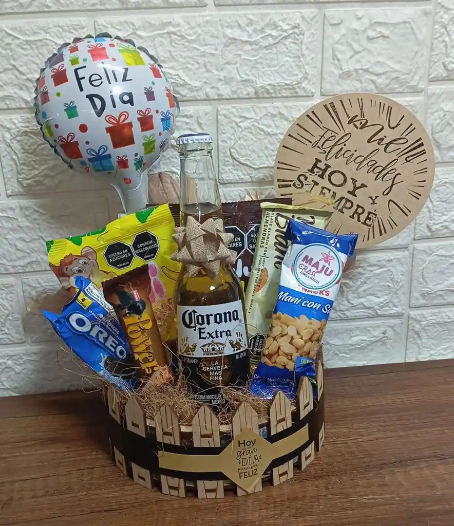 ancheta en base de madera con chocolates ,galletas ,cerveza ,gomitas