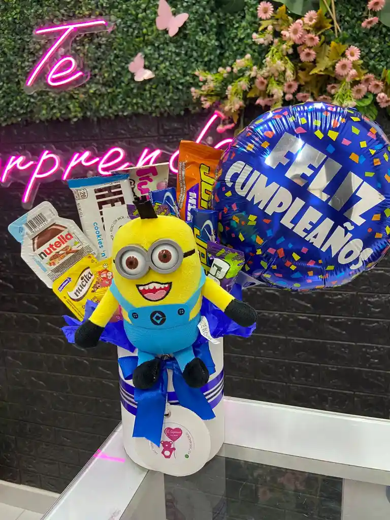 Esta encantadora ancheta de cumpleaños incluye una selección variada de dulces y golosinas, acompañada de un adorable peluche mini de los Minions. Entre los chocolates y dulces, se encuentran: Chocolate Hershey Blanco Trululu Chocolores Blanco Nucita Mini Nutella Jet Mini Gol Jumbo Mix Gomitas aro Trululu Además, la ancheta está decorada con un globo azul con el mensaje "Feliz Cumpleaños" y un lazo azul que le da un toque festivo y alegre. Ideal para sorprender y alegrar a esa persona especial en su día.