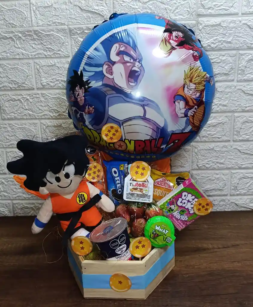Canasta de regalo temática de Dragon Ball Z que incluye un globo, un peluche de Goku, dulces variados, yogur y fresas frescas. Ideal para sorprender a cualquier fanático.