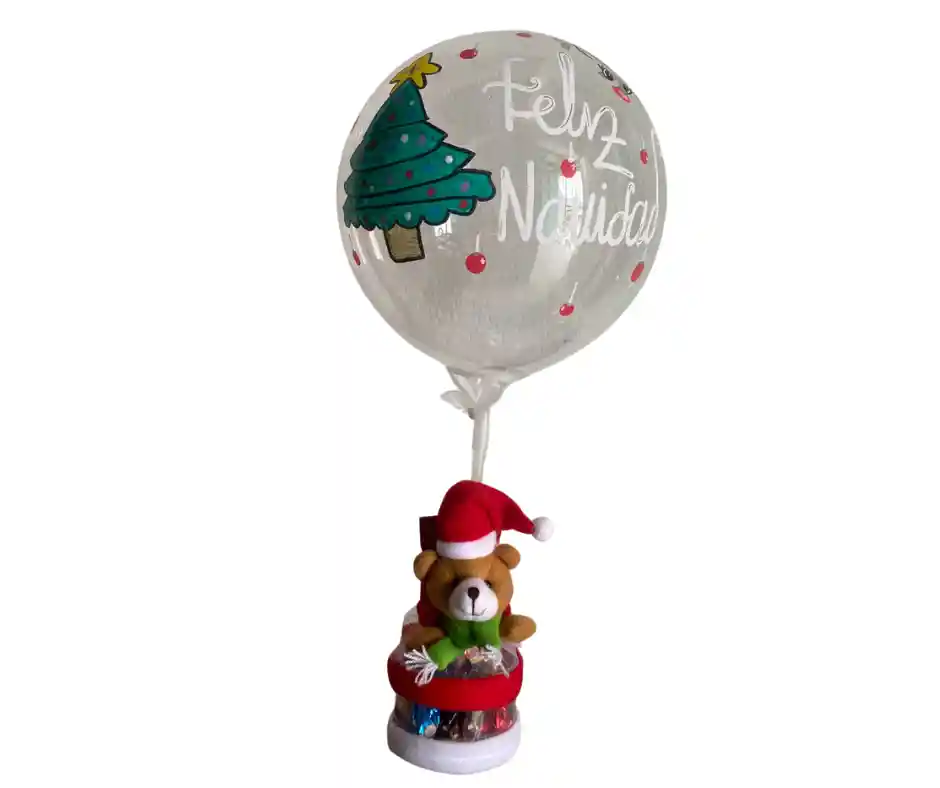 Ancheta de peluche pequeño navideño relleno de dulces surtidos, más un globo burbuja personalizado de navidad