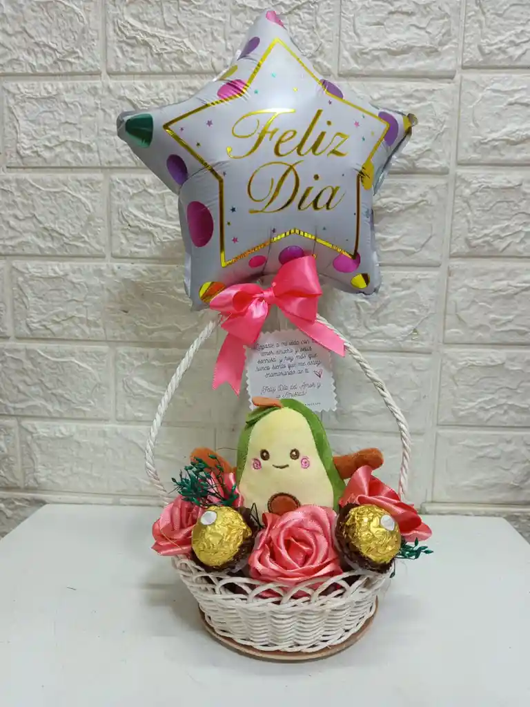 aguacatico de amor en peluche con rosa eterna y chocolates en canasta de mimbre