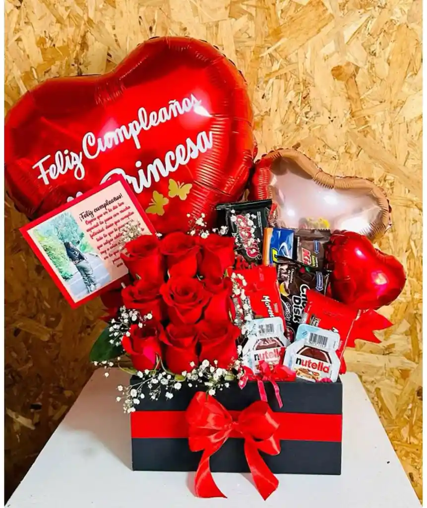 ANCHETA CON DECORACION DE CORAZONES , DULCES VARIOS Y ROSAS NATURALES