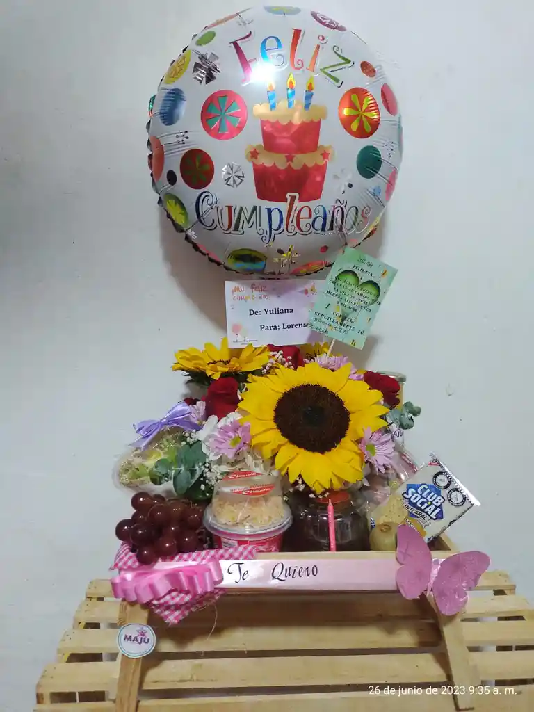 Ancheta de desayuno o mediatarde con frutas ,jugo, arreglo floral y mas
