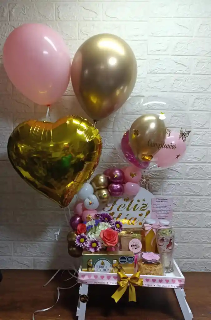 incluye un delicioso desayuno/merienda gourmet, un vibrante arreglo floral, globos festivos y chocolates Ferrero Rocher. ¡Perfecto para celebrar cualquier ocasión especial! Sanduche gourmet mix de fruta en contenedor de vidrio Delicioso Cheesecake Globo grande con globos en helio