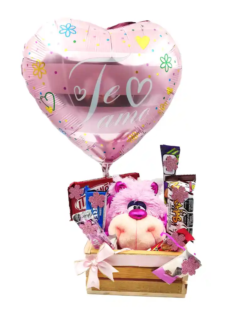 Hola! Somos Globos y Peluches Masmelo Por tu compra te llevas ancheta de 50X30cm que contiene: 1 Peluche de Oso Rosa 20x20 cm 1 Caja de madera decorada 20x20x10 cm 1 Globo Metalizado Corazon 45x45 cm (Diseño se puede cambiar a tu elección) 1 Galleta Waffer Italiano Chocolate Blanco 80g 1 Barra de Caramelo y Chocolate Nubi 25g 1 Cono Galleta Wafino Chocolate 12g 1 Malvavisco Recubierto con Chocolate Manchas 26g 1 Gomita Trululu Feroz 18g 1 Paquete de Galletas Oreo 35g 1 Barra de Caramelo con Chcocolate GOL 28g 1 Decoración papel Seda Rosa Decoración Flores escarchadas