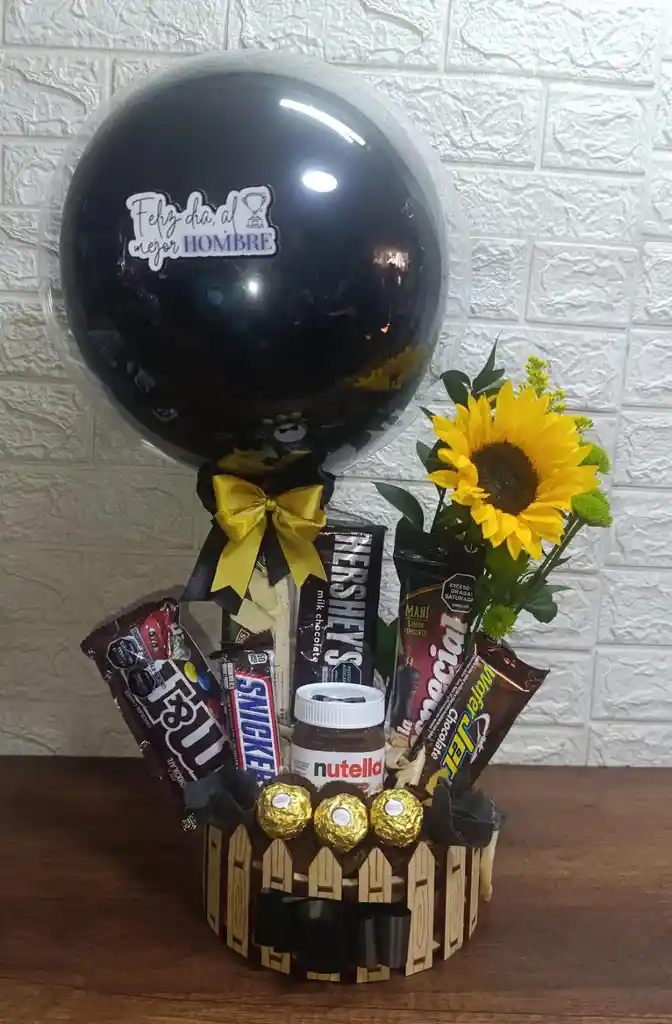Cesta de regalo elegante para hombre, incluye globo "Feliz Día al Mejor Hombre", girasol, Nutella, Ferrero Rocher, Hershey's, Snickers, M&M's, galleta wafer jet, frutos secos la especial. Ideal para sorprender en cualquier ocasión especial.
