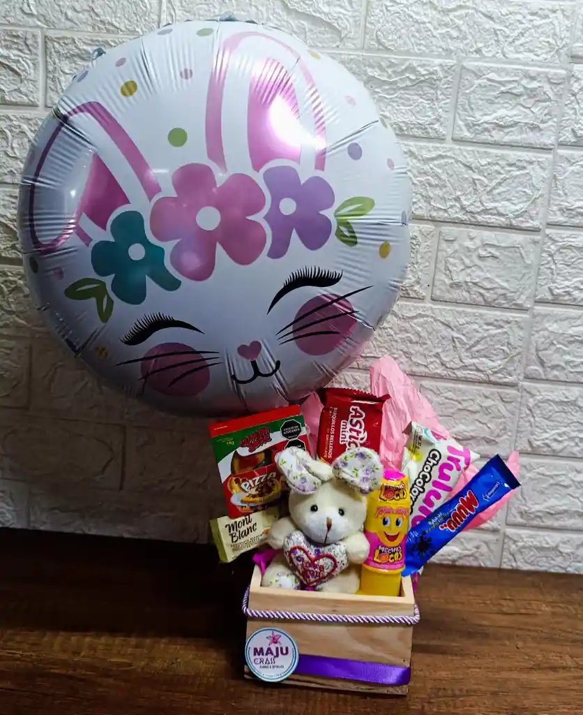 Encantadora cesta de regalo que incluye un globo metálico de coneja, un tierno peluche de conejo con corazón y una variada selección de dulces y golosinas. Para alegrar el día.