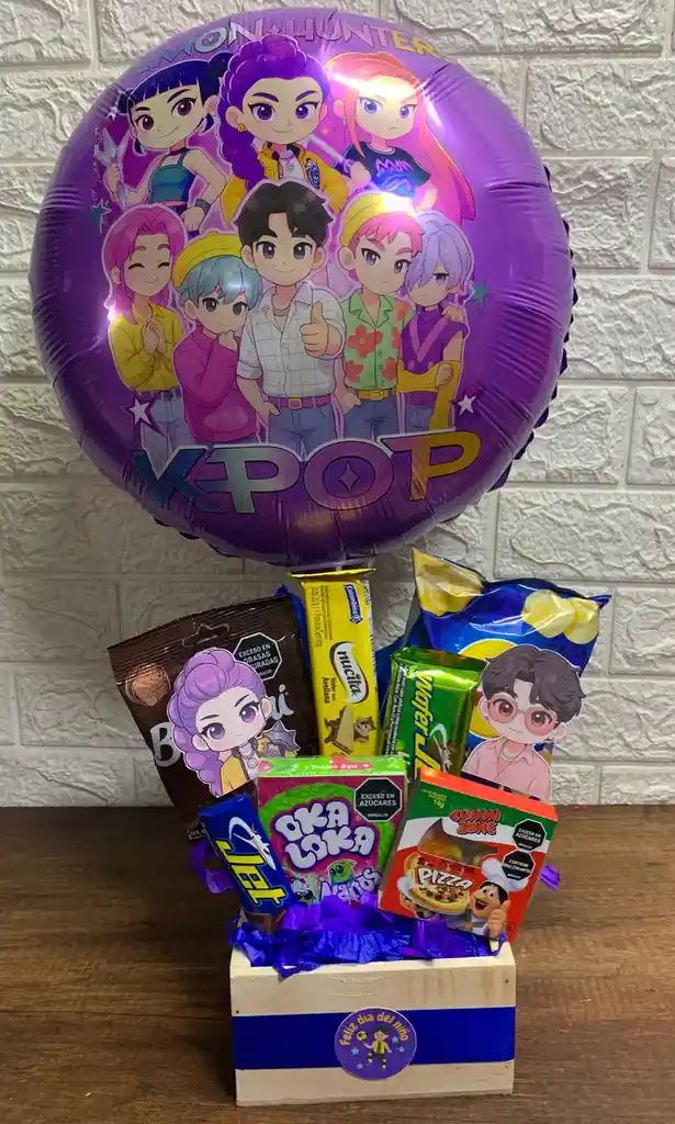 Caja de regalo vibrante con temática K-Pop, incluye un globo decorativo y una deliciosa selección de dulces como Gomitas de chocolate, galletas nucita y wafer jet, papas, pizza en gomita, chocolatina jet para sorprender a los fans de este género musical.